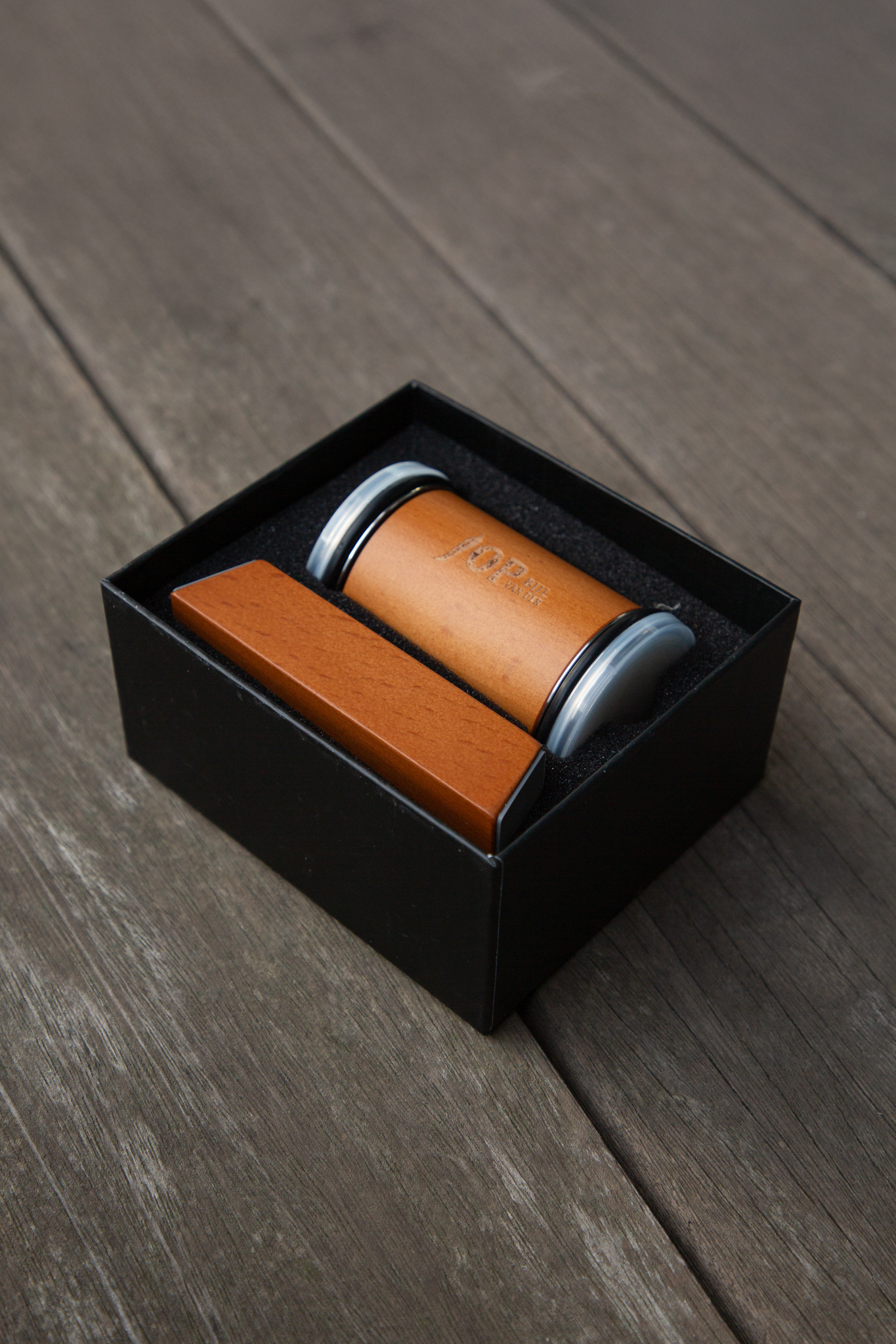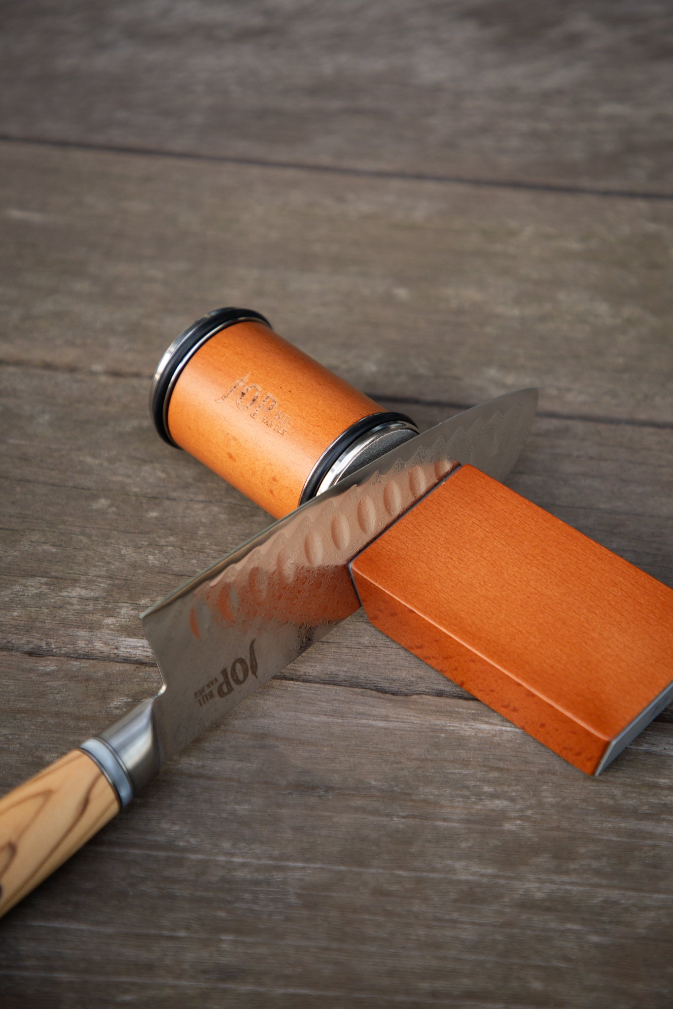 Maak slijpen eenvoudig, veilig en effectief. De rollende messenslijper van Jop van der Bijl houdt de slijphoek constant, zodat u keukenmessen in korte tijd weer scherp maakt zonder het mes te beschadigen. Uitstekend geschikt voor het slijpen van o.a. Jop's Santokumes. Compact, veilig en ideaal voor dagelijks onderhoud. Met Jop’s naam stijlvol gegraveerd in het hout.
